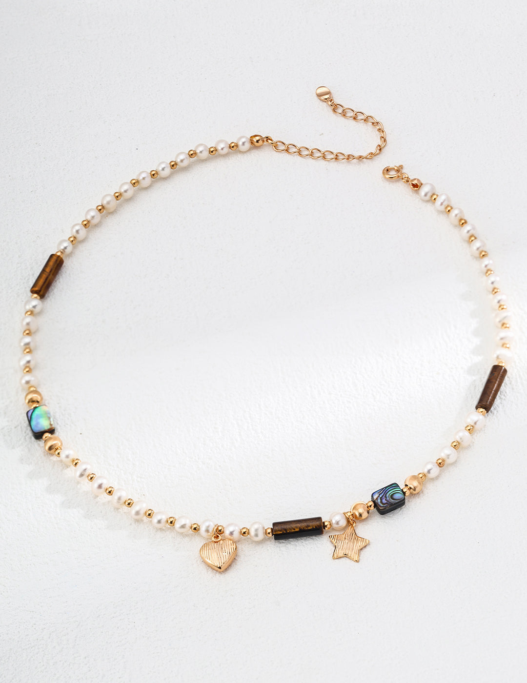 Pearl size: ~5mm | Tiger’s Eye: ~15×5mm | Abalone Shell: ~3×6×8mm